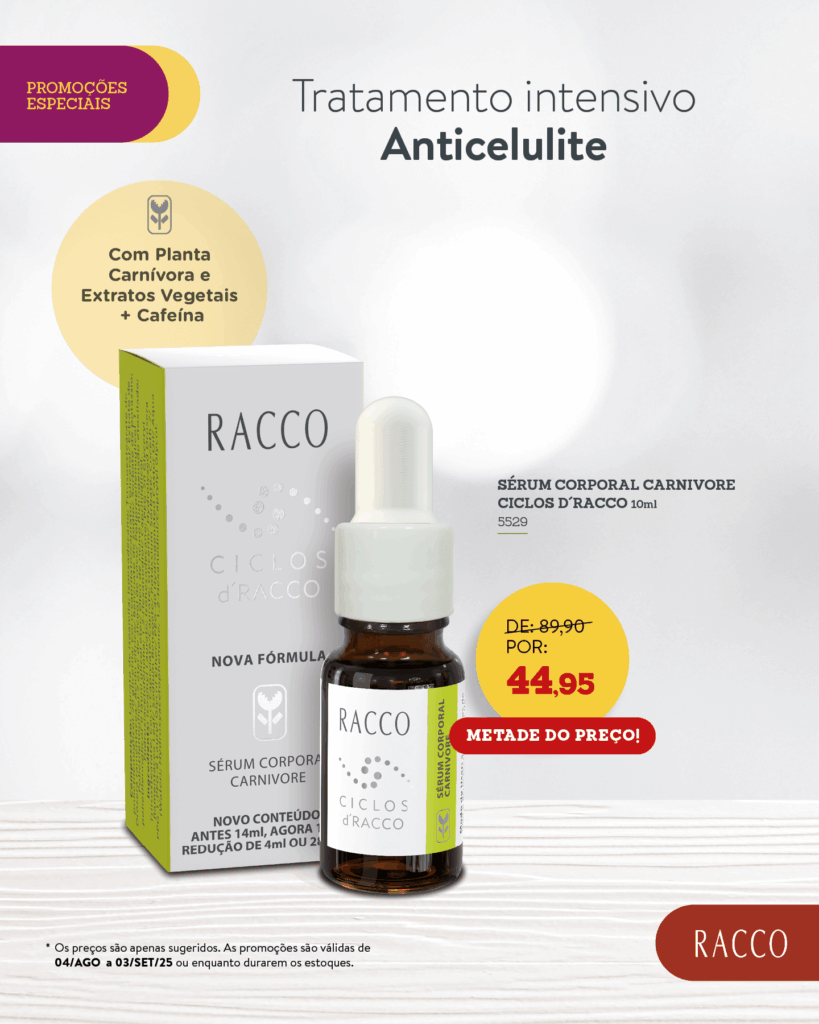 Fórmula inovadora à base de extrato de planta carnívora que reduz gordura localizada, hidrata, revigora e firma a pele. Quando usado com o Sérum Soufflé Anticelulite ou Gel Redutor de Medidas Ciclos, potencializa os resultados e reduz visivelmente a celulite.